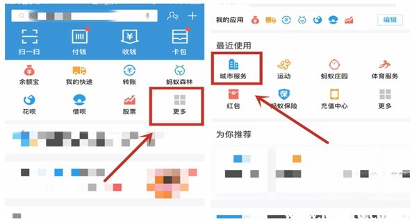 1、打开支付宝,进入主页后点击“更多”,在众多功能中找到“城市服务”。