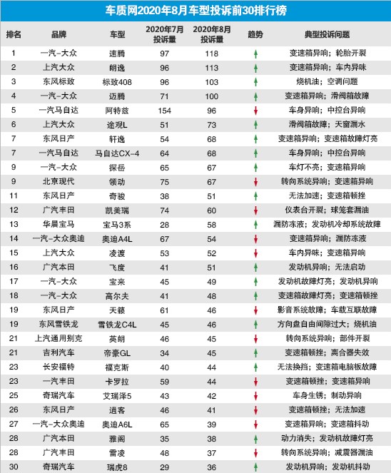 汽车行业关注(autochat.com.cn)09月02日报道——进入2020年8月,汽车投诉榜率先公布,30款车型的投诉排名也正式确认,大众品牌汽车在前十名中出现5款成为本月最大亮点。根据车质网统计,8月共收到车主有效投诉信息10112宗,同比上涨35.9%,月度实名投诉量连续第二个月突破1万宗。综合来看,在部分车型的某些共性问题影响下,国内汽车月度实名投诉量再次突破1万宗,同比延续了高增长态势...