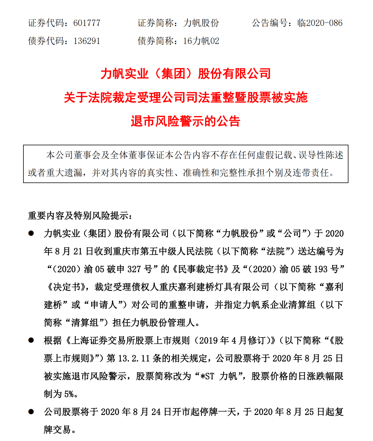 汽车行业关注(autochat.com.cn)08月23日报道——力帆实业(集团)股份有限公司发布公告,于23日收到重庆市第五中级人民法院送达编号为“(2020)渝05破申327号”的《民事裁定书》及“(2020)渝05破193号”《决定书》,裁定受理债权人重庆嘉利建桥灯具有限公司对公司的重整申请,并指定力帆系企业清算组担任力帆股份管理人。根据《上海证券交易所股票上市规则(2019年4月修订)》第...