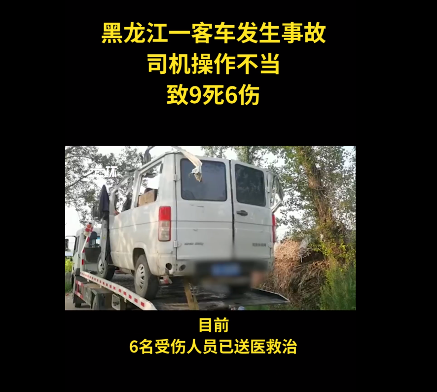 黑龙江哈尔滨五常市一客车发生车祸,事故导致9死6伤。央视新闻官方微博发布消息,8月10日11时10分,黑龙江五常市山长路33km处,一小型普通客车(核载7人,实载15人),司机操作不当,驶入道路右侧沟内撞绿化树木,致9人死亡(当场死亡8人、后抢救无效死亡1人),6人受伤,1车损坏。目前,6名受伤人员已送医救治。