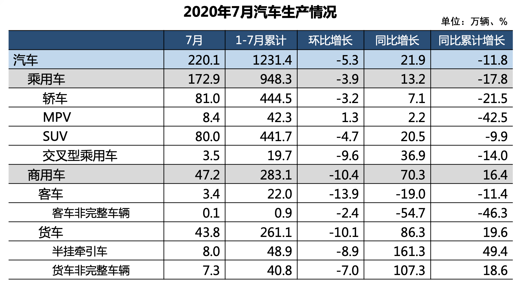 汽车行业关注(autochat.com.cn)08月12日报道——8月12日,中国乘联会正式公布了7月市场数据,乘用车三大细分领域销量榜单也随即确定。数据显示,7月份国内狭义乘用车市场销量为159.9万辆,同比增长7.9%,环比则下降3.6%。其中7月份轿车销量77.3万辆,同比增长3.5%;SUV销量73.1万辆,同比增长13.6%;MPV销量9.5万辆,同比增长3.2%。三大领域在2020年首...