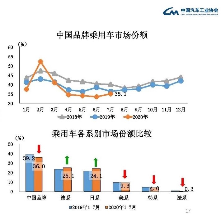 汽车行业关注(autochat.com.cn)08月12日报道——7月汽车销量实现大幅增长,但中国品牌乘用车市场份额再一次下降。中汽协数据显示,7月我国汽车销量为211.2万辆,同比增长16.4%,其中乘用车销量占据166.5万辆,同比增长8.5%。在各大车系市场占有率方面,中国品牌乘用车销量仍高居首位,但市场份额则同比持续下滑,而德系、日系品牌崛起。7月,中国品牌乘用车共销售58.5万辆,占乘用...