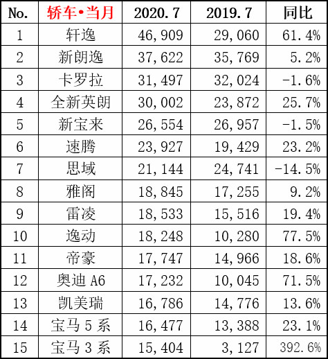 汽车行业关注(autochat.com.cn)08月15日报道——2020年7月轿车销量榜(前十名):1.日产轩逸44236辆;2.大众朗逸35925辆;3.丰田卡罗拉31517辆;4.本田思域26240辆;5.大众速腾21393辆;6.大众宝来20678辆;7.本田雅阁20093辆;8.丰田雷凌19537辆;9.长安逸动18189辆;10.丰田凯美瑞17789辆。欢迎订阅微信公众号《汽车行业关注...