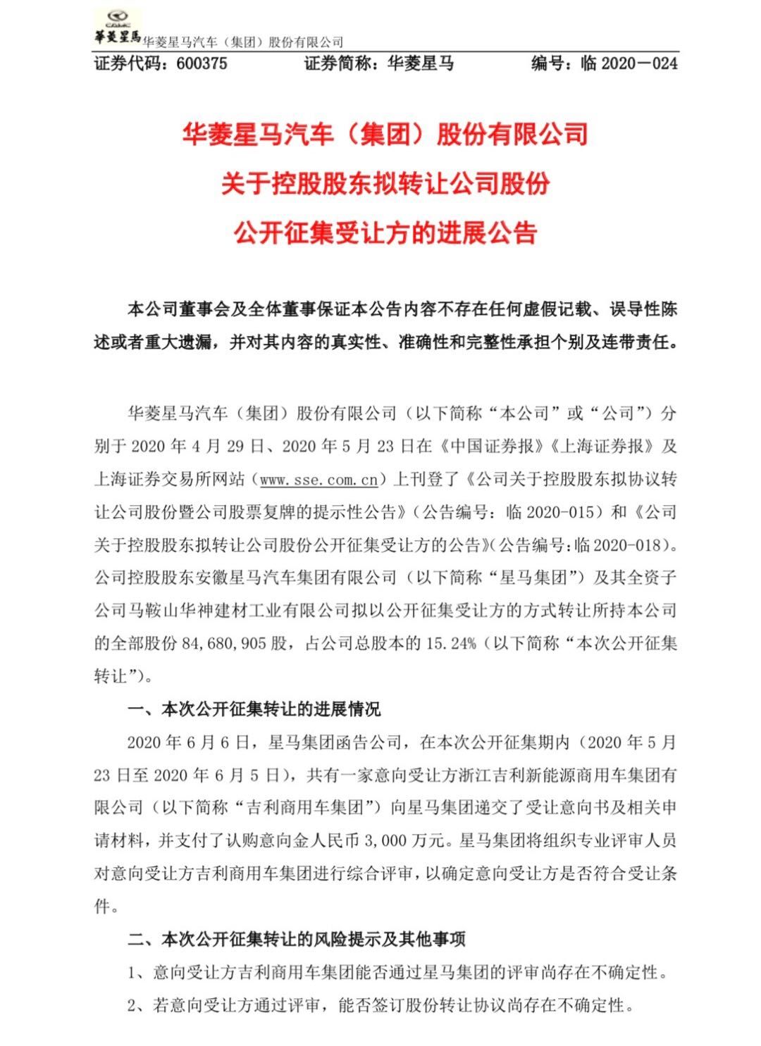 针对外界盛传的吉利商用车有意收购华菱星马一事,6月7日华菱星马发布公告,称吉利商用车意向受让控股股东拟转让的公司股份。华菱星马称,控股股东拟转让公司股份公开征集受让方事项取得进展,公开征集期内,意向受让方吉利商用车集团向控股股东星马集团递交了受让意向书及相关申请材料,并支付了认购意向金3000万元。星马集团将确定意向受让方是否符合受让条件。其控股股东星马集团及全资子公司华神建材拟通过公开征集受让方...