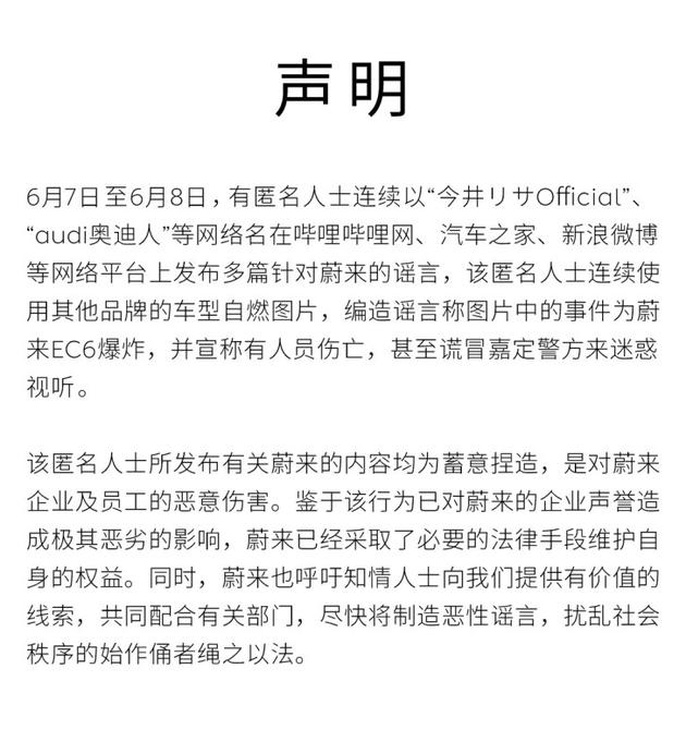 汽车行业关注(autochat.com.cn)06月09日报道——6月9日蔚来汽车发布官方声明,称有匿名人士在网络平台上发布多篇针对蔚来的消息,编造蔚来EC6爆炸、人员伤亡的事件,该匿名人士所发布有关蔚来的内容均为蓄意捏造,蔚来已经采取法律手段维护权益。官方声明内容为:6月7日至8日,有匿名人士在网络平台上发布多篇针对蔚来的谣言,该匿名人士连续使用其他品牌的车型自燃图片,编造谣言称图片中的事件为蔚...