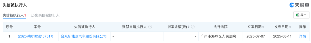 据天眼查信息显示,8月11日,哪吒汽车关联公司合众新能源汽车股份有限公司因违反财产报告制度,被广州市海珠区人民法院列为失信被执行人,履行情况为全部未履行。同一日,合众新能源汽车股份有限公司新增一则被执行人信息,执行标的为68.16万元,执行法院为郑州市惠济区人民法院。目前合众新能源汽车股份有限公司已是司法缠身,截至发稿前,该公司共存在7则被执行人信息,被执行总金额为350.03万元。此外,该公司还...