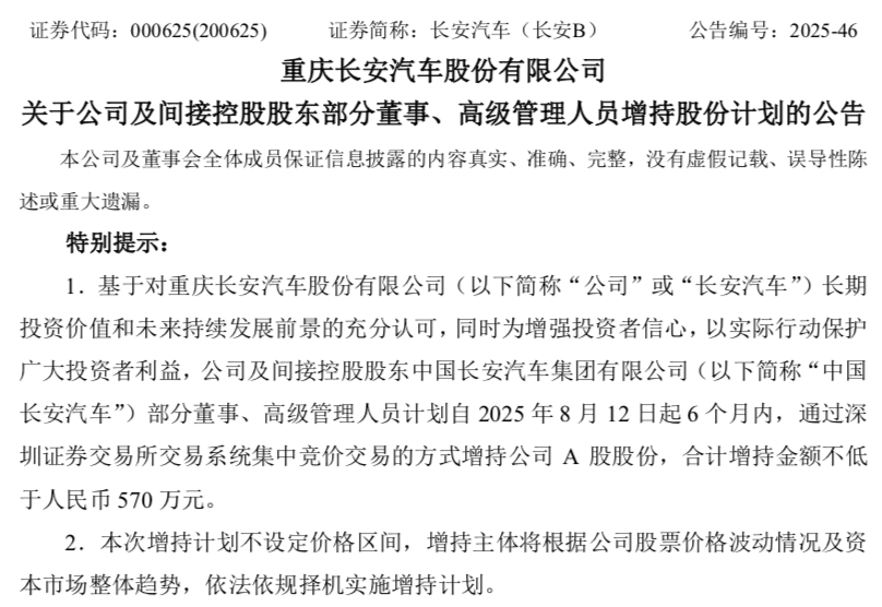 8月11日晚,重庆长安汽车股份有限公司(下称“长安汽车”)发布《关于公司及间接控股股东部分董事、高级管理人员增持股份计划的公告》。公告内容显示,公司及间接控股股东中国长安汽车集团有限公司部分董事、高级管理人员计划自2025年8月12日起6个月内通过深圳证券交易所交易系统集中竞价交易的方式增持公司A股股份,合计增持金额不低于人民币570万元。本次计划增持主体为中国长安汽车现任全体董事、高级管理人员以...