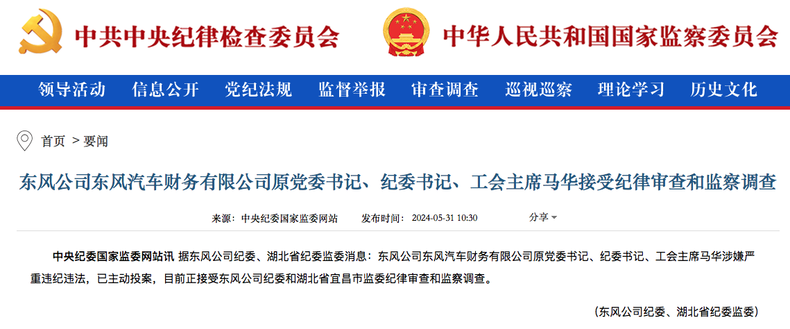 5月31日,据东风公司纪委、湖北省纪委监委消息:东风公司东风汽车财务有限公司原党委书记、纪委书记、工会主席马华涉嫌严重违纪违法,已主动投案,目前正接受东风公司纪委和湖北省宜昌市监委纪律审查和监察调查。官网显示,东风汽车财务有限公司成立于1987年5月7日,是经同期监管机构批准设立的全国第一家企业集团财务公司,公司注册资本金90亿元人民币,由东风汽车集团股份有限公司全资控股经营,后者由东风汽车集团有...