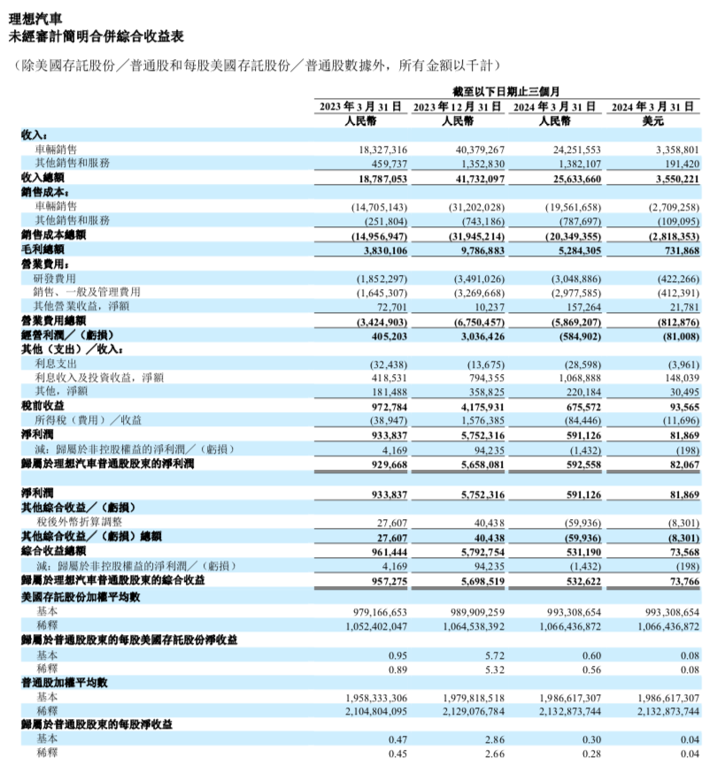 5月20日,理想汽车对外公布2024年第一季度财报。财报显示,理想汽车第一季度营收256亿元,同比增长36.4%,市场预估为255.8亿元;第一季度经调整净利润为13亿元(扣除股权激励费用),同比下降9.7%;毛利率仍保持在20.6%,上年同期为20.4%,主要原因是车辆毛利率下降。研发费用方面,理想汽车一季度研发费用为30亿元,同比增长64.6%;销售、一般及管理费用为30亿元,同比增长81.0...