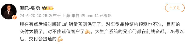 5月20日晚间,哪吒汽车CEO张勇在微博发文称:“现在有点后悔对哪吒L的销量预测保守了,对车型品种结构预测也不准,目前的交付太慢了,对不住诸位客户了。大生产系统的兄弟们都在前线奋战,25号以后,交付会提速的。”4月22日,哪吒L增程版车型正式上市。新车共推出4款车型,售价区间为12.99万-15.99万元。两天后,张勇在微博称,哪吒L的大定数据晚点发,并作出了几点说明,包括1、L上市是我们新车上市...