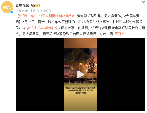 据报道,5月22日凌晨,乌鲁木齐赛博特国际汽车城长城汽车一4S店起火。据网络上流传的视频显示,现场火势迅猛并带有浓烟冒出。事故发生后,多辆消防车赶至现场救援,火灾持续将近三小时后才被扑灭。针对长城汽车新疆一4S店起火事件,长城汽车股份有限公司CGO李瑞峰发文公布事故详情并发布解决方案。李瑞峰称,昨晚十二点多,新疆天宇华骏经销店因变电箱短路导致店内起火,因天花板坠落导致三台展车轻微受损,好在没有人员...