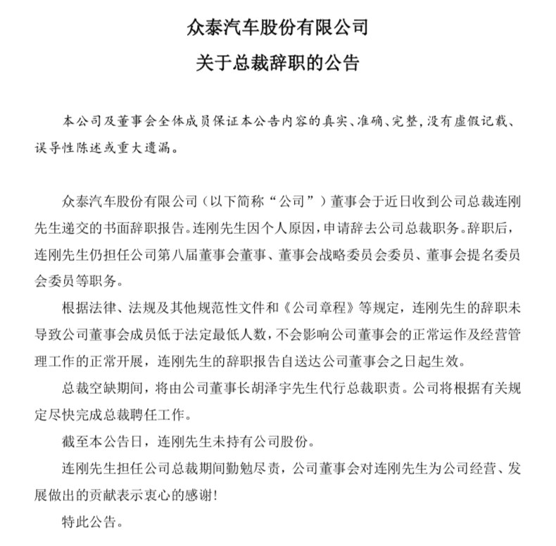 3月27日,众泰汽车发布公告称,因个人原因,连刚申请辞去公司总裁职务,辞职后仍担任公司第八届董事会董事、董事会战略委员会委员、董事会提名委员会委员等职务。在总裁空缺期间将由众泰汽车董事长胡泽宇先生代行总裁职责。众泰汽车在公告中指出将根据有关规定尽快完成总裁聘任工作。资料显示,连刚于1960年出生,哈尔滨工程大学毕业,博士研究生学位,现任中国长安汽车集团副总裁、众泰汽车股份有限公司第八届董事会董事、...