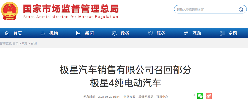 3月29日,极星汽车销售有限公司根据《缺陷汽车产品召回管理条例》和《缺陷汽车产品召回管理条例实施办法》的要求,受委托向国家市场监督管理总局备案了召回计划。决定自即日起,召回2023年11月29日至2024年2月1日期间生产的部分2023-2024年款国产极星4纯电动车型,共计1867辆。召回原因是本次召回范围内部分车辆因制动控制器软件问题,可能触发制动控制降级,造成制动电子助力等功能失效,制动效能...