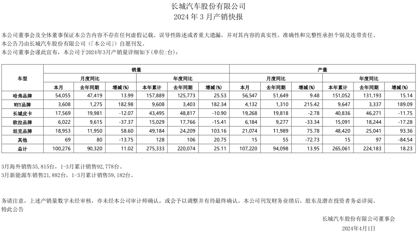 4月1日,长城汽车发布3月产销数据。数据显示,2024年3月,长城汽车销量为100276辆,同比增长11.02%;1-3月累计销量为275333辆,同比增长25.11%。目前,长城汽车旗下共有五大汽车品牌,其中乘用车市场包括哈弗、坦克、欧拉、魏牌。其中,哈弗品牌是长城汽车的销量支柱,销量占总销量一半以上。细分到3月各大品牌销量来看,长城汽车旗下品牌3月增长幅度最高的依然是魏牌,同比增长182.98...
