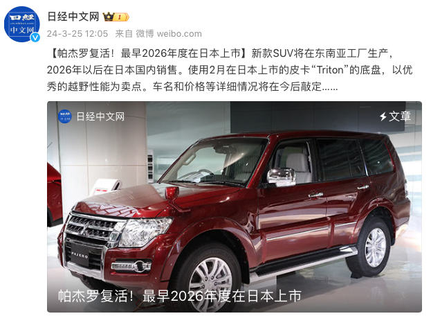 3月25日,据《日经中文网》报道,三菱汽车旗下经典车型——帕杰罗将复活,该车将在东南亚工厂生产,最早于2026年在日本市场上市。另据日媒报道称,新一代帕杰罗将基于Triton的梯形大梁底盘打造,呈现最原汁原味的越野风格,该车计划在泰国进行量产,之后再运输至日本市场。网上曝光的预想图显示,新车前脸采用类似Triton的粗壮饰条点缀,搭配全新样式头灯组,整体视觉十分粗犷。车身线条流畅,给人一种稳健而有...
