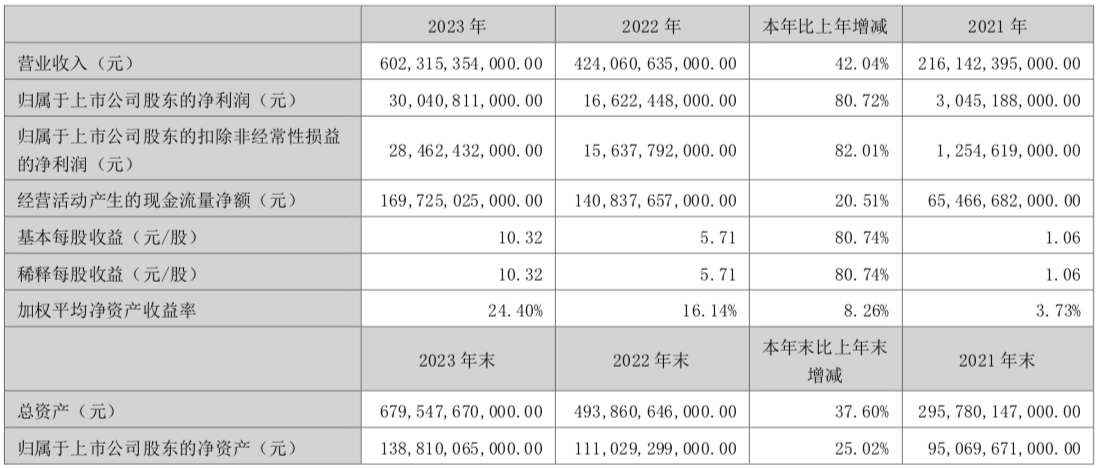 3月26日,比亚迪对外公布2023年财报。报告显示,比亚迪2023年实现营业收入6023.15亿元,同比增长42.04%,其中,汽车及相关产品营收4834.53亿元,同比增长48.9%,占总营收80.27%;实现净利润300.41亿元,同比增长80.72%;扣非净利润284.62亿元,同比增长82.01%。截至2023年末,总资产6795.48亿元,同比增长37.6%。比亚迪利润大幅增长,与其强劲...