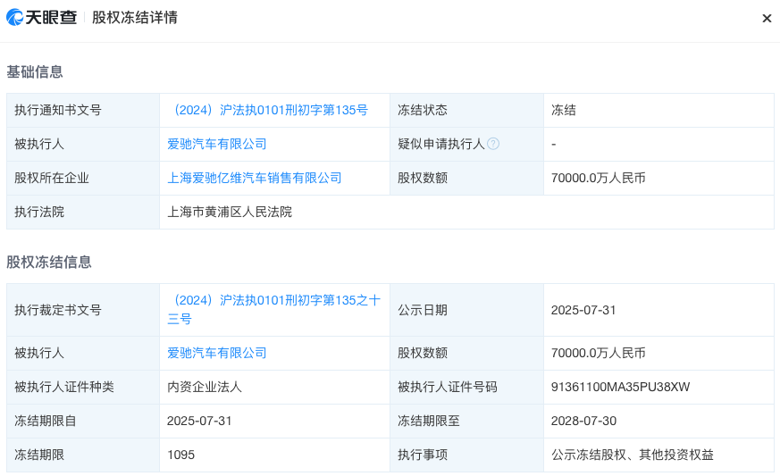 天眼查信息显示,7月31日,爱驰汽车有限公司新增一则股权冻结信息,股权所在企业为上海爱驰亿维汽车销售有限公司,冻结股权数额为7亿人民币,冻结期限自2025年7月31日至2028年7月30日共3年,执行法院为上海市黄浦区人民法院。这并非7月爱驰汽车有限公司首次出现股权冻结信息,7月3日,爱驰汽车有限公司新增了16则股权冻结信息,股权所在企业均为爱驰汽车有限公司,执行法院为上海市黄浦区人民法院,冻结期...