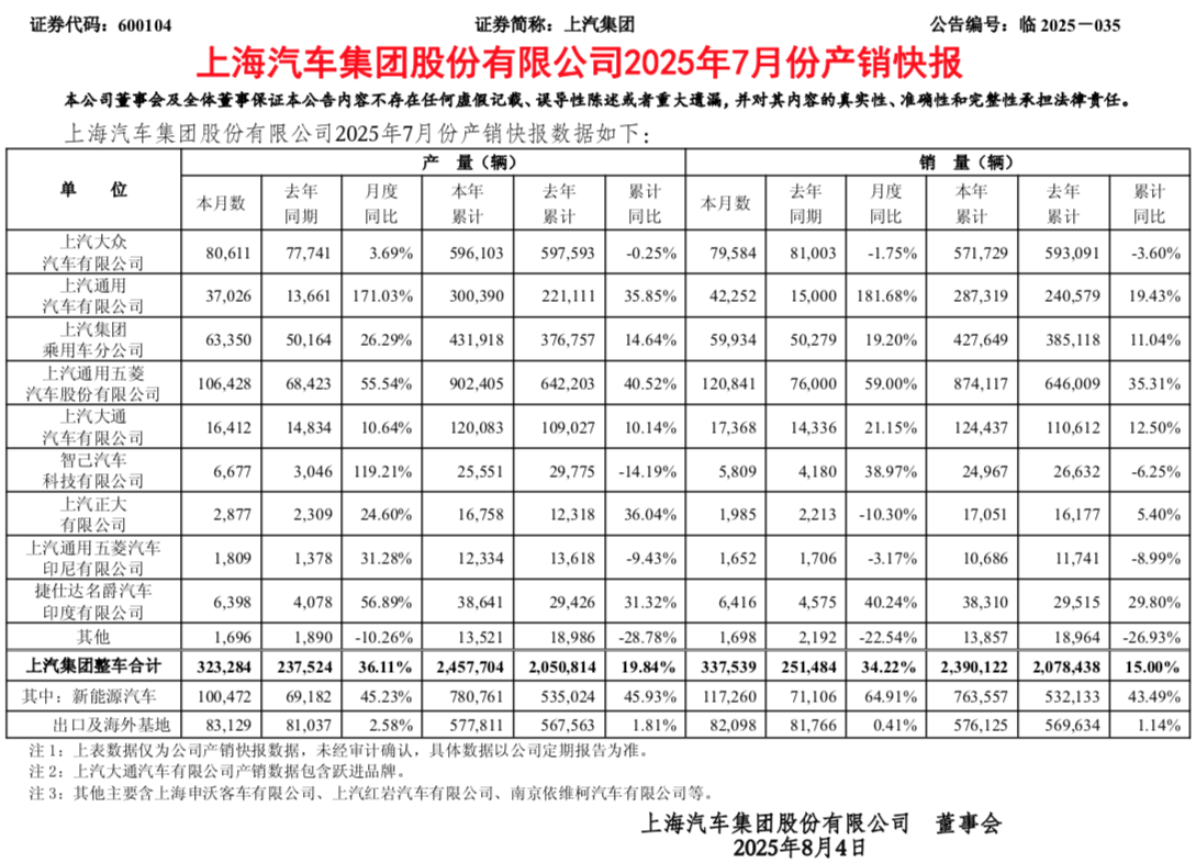 8月4日,上汽集团对外发布2025年7月以及1-7月销量快报。数据显示,2025年7月,上汽集团整车合计销量为337539辆,同比增长34.22%,今年前7月累计销量为2390122辆,同比增长15.00%。其中,7月新能源汽车销量为117260辆,同比增长64.91%,今年前7月累计销量为763557辆,同比增长43.49%。此外,7月出口汽车为82098辆,同比增长0.41%,前7月累计销量为...