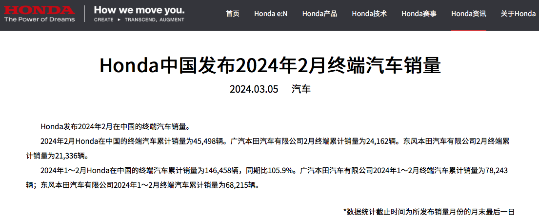 3月5日,本田中国公布2024年2月终端汽车销量。数据显示,2月本田在中国的终端汽车销量为45498辆,同比下滑38.63%。其中,广汽本田为24162辆,同比下滑32.56%;东风本田为21336辆,同比下滑44.31%。2024年1-2月,本田在中国的终端汽车累计销量为146458辆,同期比105.9%(即同比下滑5.87%)。其中,广汽本田累计销量为78243辆,同比增长2.80%;东风本田...