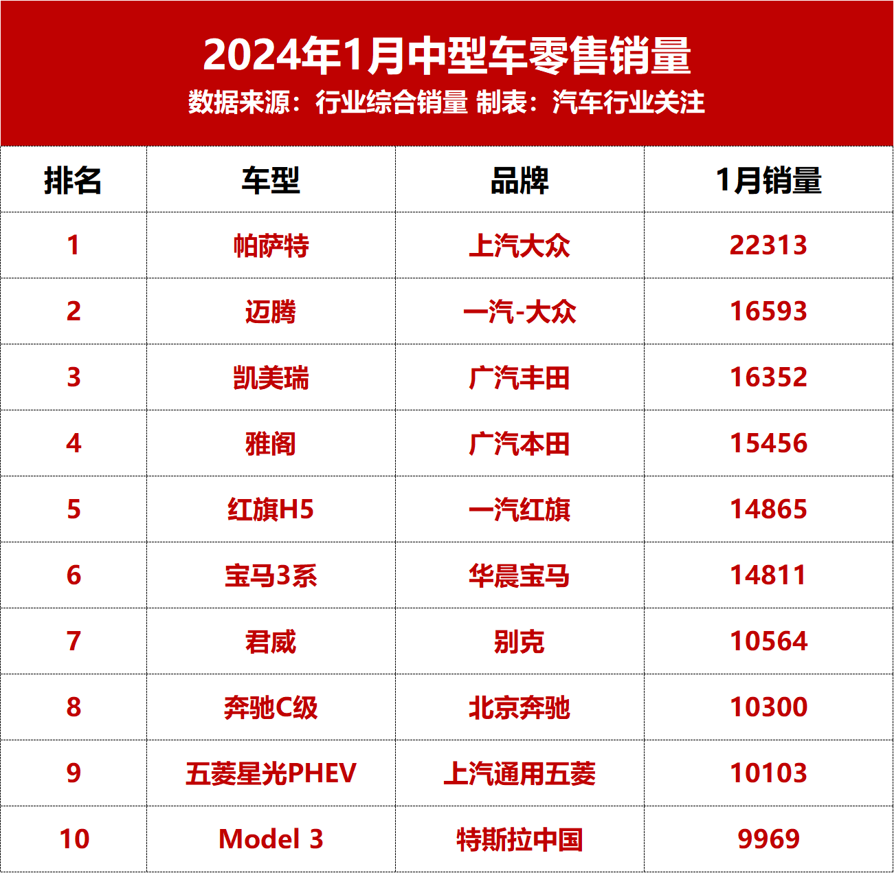 乘联会数据显示,2024年1月乘用车市场零售销量为203.5万辆,同比增长57.4%,环比下降13.9%。细分车型中,1月轿车销量为90.5万辆,同比增长48.6%,占所有乘用车销量44.47%。其中,从《汽车行业关注》统计的1月中型轿车销量top10榜单来看,1月共有9款车型销量超万辆,分别为帕萨特、迈腾、凯美瑞、雅阁、红旗H5、宝马3系、君威、奔驰C级和五菱星光PHEV。与2023年12月相比...