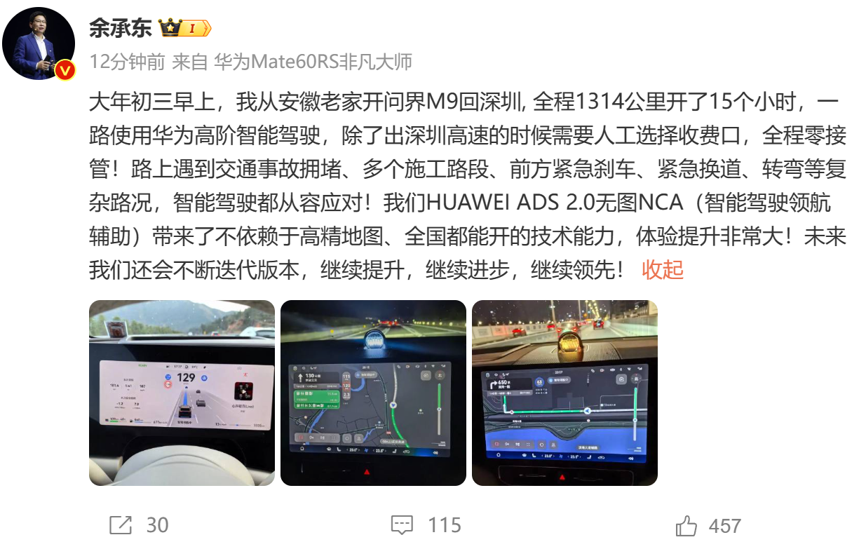 余承东又上热搜!这次是因为其晒出开着自家的问界M9回深圳,全程1314公里一路智能驾驶无接管、零接管。2月13日,华为智能汽车解决方案BU董事长余承东在微博发文表示,大年初三早上,其从安徽老家开问界M9回深圳,全程1314公里开了15个小时,一路使用华为高阶智能驾驶,除了出深圳高速的时候需要人工选择收费口,全程零接管。路上遇到交通事故拥堵、多个施工路段、前方紧急刹车、紧急换道、转弯等复杂路况,智能...