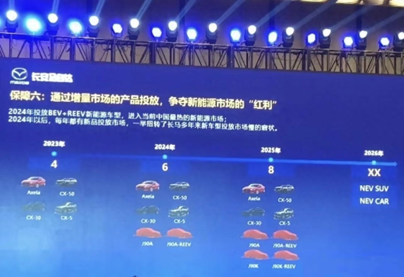 日前,网上曝光了长安马自达新车规划。据了解,今年长安马自达将推出BEV+REEV(纯电+增程)新能源车型,进入国内新能源市场;2024年以后,每年都有新品投放市场,以此扭转其多年来在新车型投放市场慢的局面。从网上曝光的图片来看,长安马自达将在2024年推出代号J90A及J90A-REEV两款新车型;2025年将推出代号J90K及J90K-REEV两款新车;2026年将推出NEWSUV、NEWCAR...