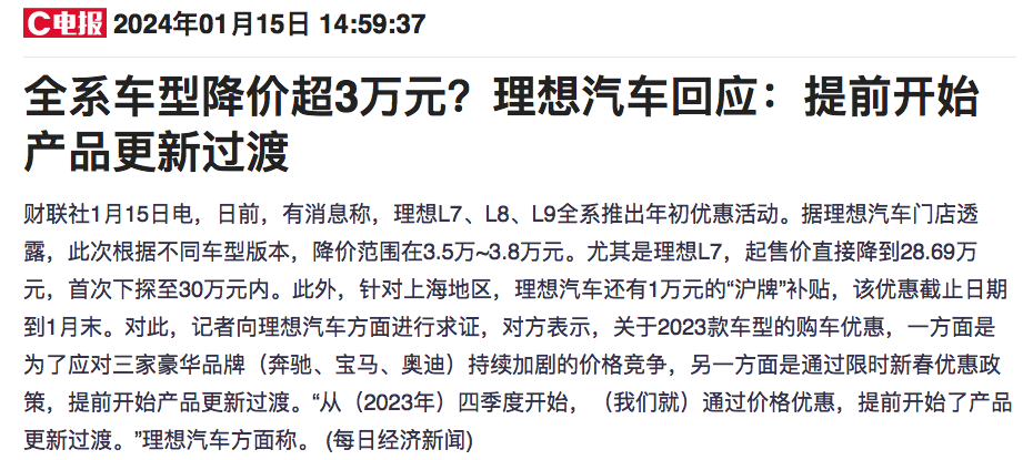 1月11月,理想汽车官方在微博宣布,“将对理想L系列车型进行配置的更新,2024款车型将在3月发布并开启交付。同时,春节将至,理想汽车推出2023款车型的优惠活动。”据终端市场现有消息,理想L7/L8/L9全系均推出优惠活动,理想汽车门店透露,此次根据不同车型版本,降价范围在3.5万-3.8万元。尤其是理想L7,起售价直接降到28.69万元,首次下探至30万元内。针对上海地区,理想汽车还有1万元的...