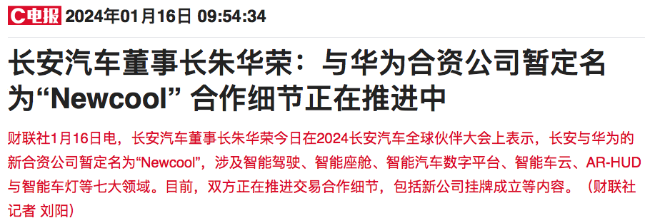1月16日,在2024长安汽车全球伙伴大会上,长安汽车董事长朱华荣表示,长安与华为的新合资公司暂定名为“Newcool”。据了解,目前长安与华为正在推进交易合作细节,包括新公司挂牌成立等内容。早在去年11月26日,长安汽车便与华为在深圳签署了《投资合作备忘录》。经协商,华为拟成立一家新公司,聚焦智能网联汽车的智能驾驶系统及增量部件的研发、生产、销售和服务。根据备忘录,华为拟将智能汽车解决方案业务的...