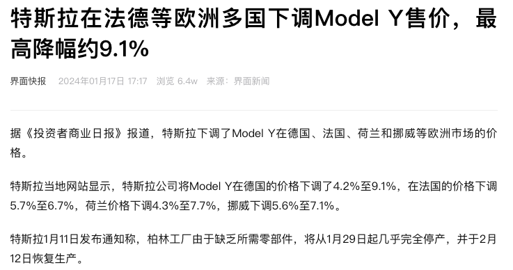 据报道,特斯拉在法国德国等欧洲多国下调ModelY售价,最高降幅约9.1%。其中,在德国市场,特斯拉ModelY长续航版和ModelY高性能版售价分别下调5000欧元至49990欧元和55990欧元,下调降幅分别为9%和8.1%;ModelY后轮驱动车型售价也下调了4.2%。在法国市场,特斯拉ModelY售价下调了5.7%至6.7%;丹麦市场降幅高达10.8%;在荷兰市场售价下调4.3%至7.7%...