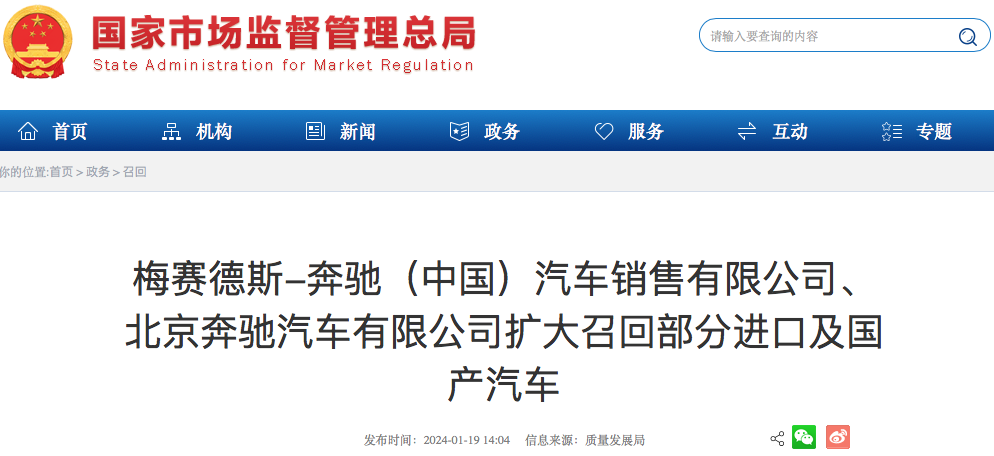 1月19日,梅赛德斯-奔驰(中国)汽车销售有限公司、北京奔驰汽车有限公司根据《缺陷汽车产品召回管理条例》和《缺陷汽车产品召回管理条例实施办法》的要求,向国家市场监督管理总局备案了召回计划。自2024年2月19日起,召回生产日期在2013年6月6日至2018年6月12日期间的部分进口A级、C级、CLA、GLESUV、S级汽车,共计14辆;生产日期在2015年1月14日至2020年8月26日期间的部分...