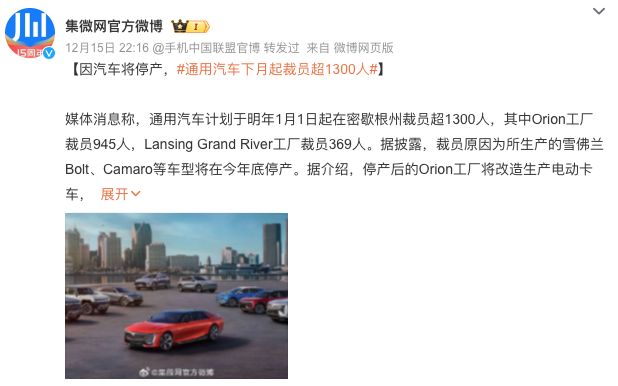 12月14日,据媒体报道,通用汽车将于明年1月初在密歇根州的两家汽车工厂裁员1300人。报道指出,通用汽车位于密歇根州的LakeOrion工厂将裁员945人,另一家在密歇根州兰辛(Lansing)的一家工厂将裁员350人,两家工厂的裁员计划将于明年1月1日生效。至于裁员原因则是因为雪佛兰Bolt、Camaro等车型将在今年底停产。据了解,通用LakeOrion工厂主要生产雪佛兰Bolt电动车车型,...