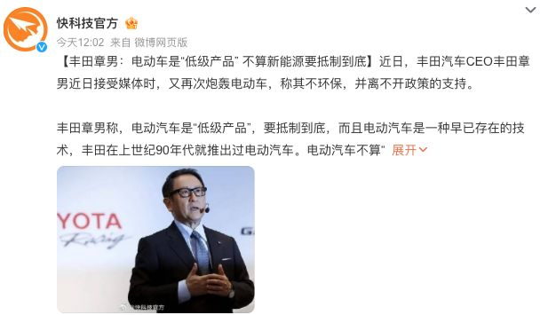 丰田章男又一次对电动车发起言论进攻。据媒体报道,近日,丰田汽车董事长丰田章男在接受采访时称,电动汽车是“低级产品”,不算新能源,要抵制到底。实际上,丰田章男对于“电动化转型”这件事一向有所犹豫。2020年丰田章男曾公开抨击纯电动车是被过度炒作了,并声称电动车会扼杀企业,需要巨额投资,并排放更多的二氧化碳。在他看来,“纯电动并非汽车行业的唯一出路”,只要能节能减排,混动也应该被提倡,冒然向纯电动车转...