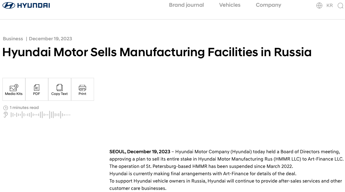 12月19日,韩国车企现代汽车在官网宣布,现代汽车召开董事会会议,批准了出售位于俄罗斯圣彼得堡的俄罗斯工厂(HyundaiMotorManufacturingRussia,HMMR)股份的议案。现代汽车表示正与俄罗斯当地企业Art-Finance就出售工厂股份的具体合同条件进行协商。也就是说,一旦双方这项交易达到,现代汽车将正式退出俄罗斯市场。截至发稿前,尚不清楚这项交易总金额是多少。有外媒报道称...