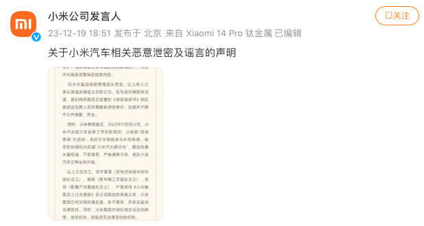 12月19日晚间,小米公司发言人在微博发布《关于小米汽车相关恶意泄密及谣言的声明》。小米汽车表示,网上批量出现关于小米汽车的恶意泄密以及不实谣言内容,涉事媒体在签署《保密承诺书》、明知保密义务与相应罚则的情况下,未经许可有意泄密保密摆设内容。经小米集团保密管理团队查实,涉事人员已承认其违反保密义务的行为。经与其所属媒体沟通,小米汽车将依据双方签署的《保密承诺书》相应条款追究两人及所属媒体泄密责任,...