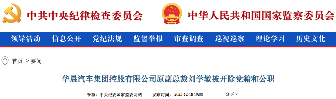 12月18日,中央纪委国家监委网站通报,据辽宁省纪委监委消息:日前,经辽宁省委批准,辽宁省纪委监委对华晨汽车集团控股有限公司原副总裁刘学敏严重违纪违法问题进行了立案审查调查。通报内容显示,刘学敏严重违反党的政治纪律、组织纪律、廉洁纪律、工作纪律和生活纪律,构成严重职务违法并涉嫌受贿犯罪。经辽宁省纪委常委会会议研究并报辽宁省委批准,决定给予刘学敏开除党籍处分;由辽宁省监委给予其开除公职处分;收缴其违...