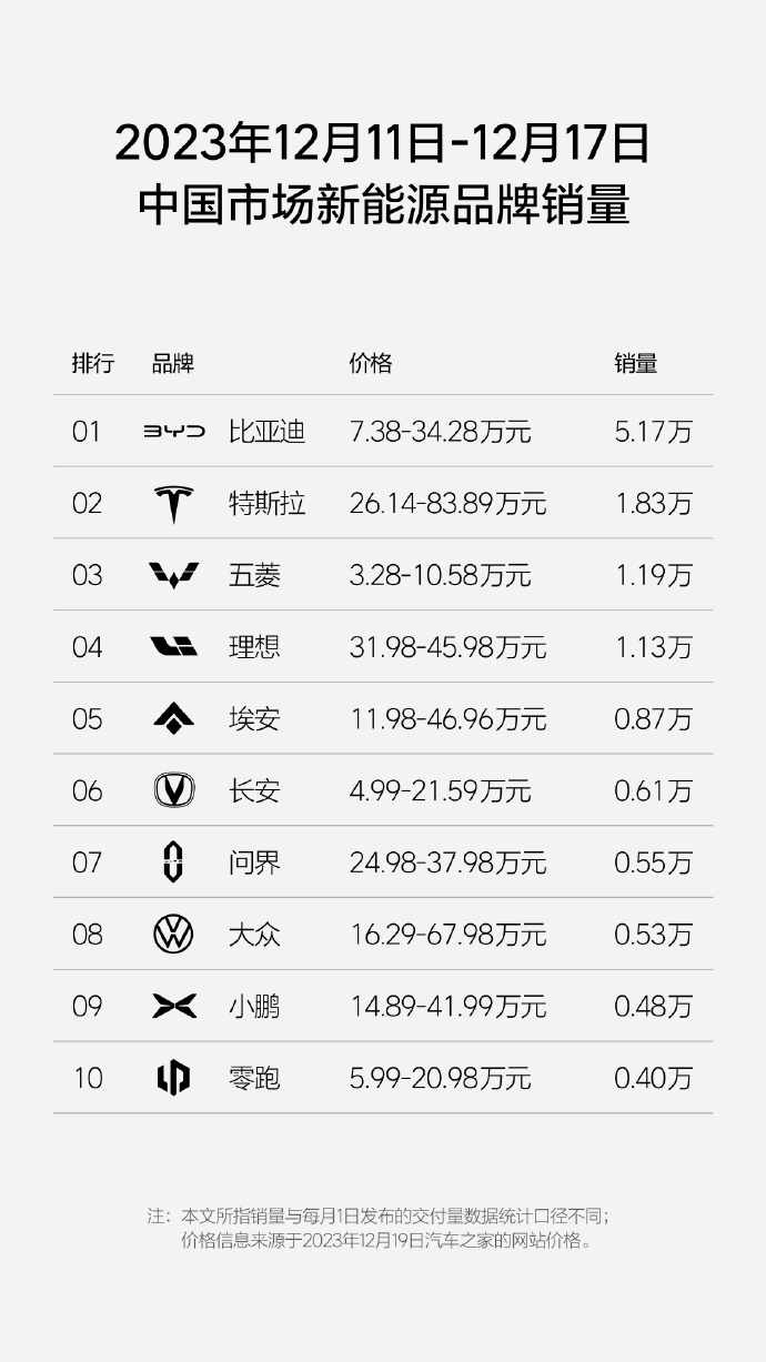最新一周(12月11日-12月17日)新能源汽车品牌销量榜单来了。从榜单排名来看,周销量前三车企分别为比亚迪、特斯拉和五菱。其中,比亚迪以5.17万辆的周销量继续蝉联榜首,特斯拉和五菱周销量则分别为1.83万辆和1.19万辆。相比于前一周(12月4日-12月10日),三家车企排名未发现变化,但均有不同程度的涨幅,作为参考,比亚迪、特斯拉和五菱周销量分别为4.74万辆、1.54万辆和1.06万辆。其...