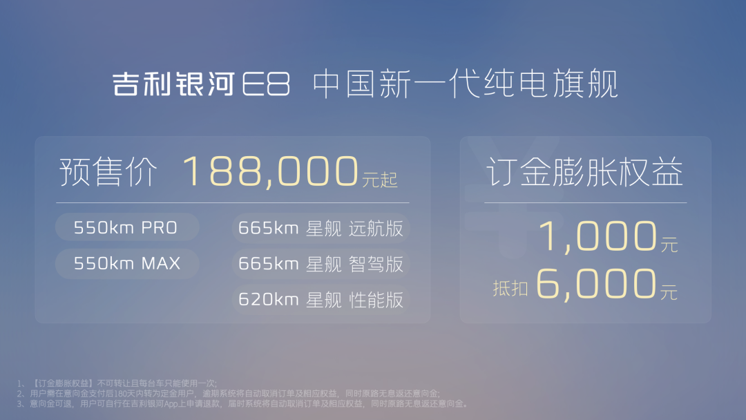 12月16日,吉利银河旗下中型轿车——银河E8正式开启预售,新车共推出5款车型,预售价为18.8万元起。据了解,吉利银河E8是吉利银河“智能纯电E系列”首款车型,基于吉利集团SEA浩瀚架构打造,预计新车将在2024年1月正式上市并交付。外观方面,新车采用“涟漪美学”全新设计语言,并融入了声、光、电等元素,整体极具未来感。具体来看,新车前脸使用大面积的封闭式面板搭配分体式LED头灯、C字型下包围装饰...