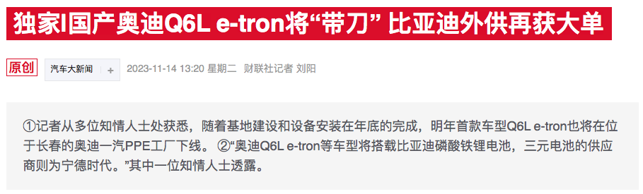 11月14日,据财联社报道,多位知情人士称,国产版奥迪Q6Le-tron将提供磷酸铁锂电池和三元锂电池版本,其中前者将使用来自比亚迪体系的刀片电池,后者供应商则来自宁德时代。据了解,国产版奥迪Q6Le-tron是首款基于PPE平台打造的纯电车型,该车将在位于长春的奥迪一汽PPE工厂下线,这是奥迪在华第一个拥有控股权、且仅生产纯电动车型的生产基地。上述知情人士称,随着基地建设和设备安装在年底的完成,...