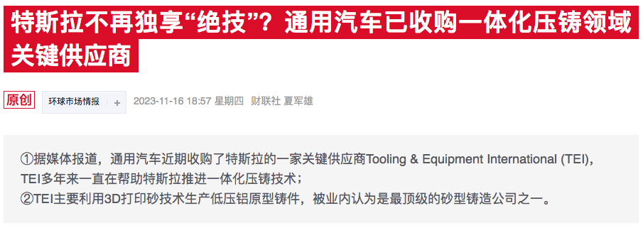 据媒体报道,通用汽车于近期收购特斯拉一家关键供应商Tooling&EquipmentInternational(TEI)。知情人士称,7月1日,TEI已正式成为通用汽车全球制造部门的一部分,该部门负责通用汽车的所有汽车和零部件制造业务。另据报道称,此次收购价值不到1亿美元,一位知情人士甚至估计,通用汽车最多花了8000万美元。针对上述收购消息,通用汽车确认已收购了TEI,并表示该收购旨在增...