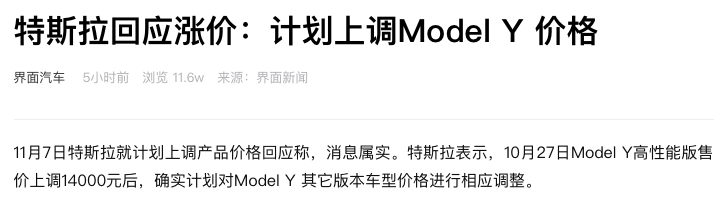 11月7日,针对多名特斯拉销售人员在朋友圈发布的ModelY即将涨价的预告,特斯拉方面回应:“消息属实。”据了解,此前多名特斯拉销售人员在朋友圈发布了ModelY即将涨价的预告,表示:“ModelY即将涨价,这是继高性能价格上调1.4万元后的延续性调整。”有销售人员称:“此次涨价可能是ModelY长续航版车型,随时可能涨价,最终价格调整幅度及时间以官方公布为准。”对此,特斯拉方面表示:今天很多媒体...