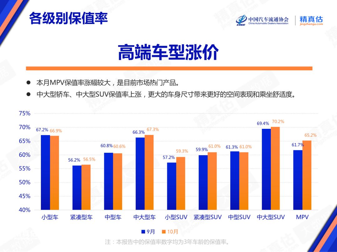 日前,中国汽车流通协会发布《2023年10月中国汽车保值率研究报告》。报告显示,10月各级别车型保值率整体基本上涨,其中MPV车型保值率涨幅较大,由9月的61.7%涨至65.2%,涨幅为3.5%。其它车型方面,紧凑型车、中大型车、小型SUV、紧凑型SUV以及中大型SUV也均有不同程度的涨幅。反观小型车和中型车则出现了轻微的跌幅,环比9月分别下滑0.3%和0.2%。具体到国别品牌的保值率表现来看,在...