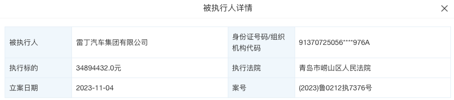 《汽车行业关注》从天眼查信息了解,11月4日,雷丁汽车集团有限公司(下称“雷丁汽车”)新增一则被执行人信息,执行标的992728元,执行法院为合肥高新技术产业开发区人民法院;11月6日,雷丁汽车再新增一则被执行人信息,执行标的34894432.0元,执行法院为青岛市崂山区人民法院。除此之外,雷丁汽车子公司山东比德文动力科技有限公司也接连被执行。11月4日,山东比德文动力科技有限公司新增一则被执行人...