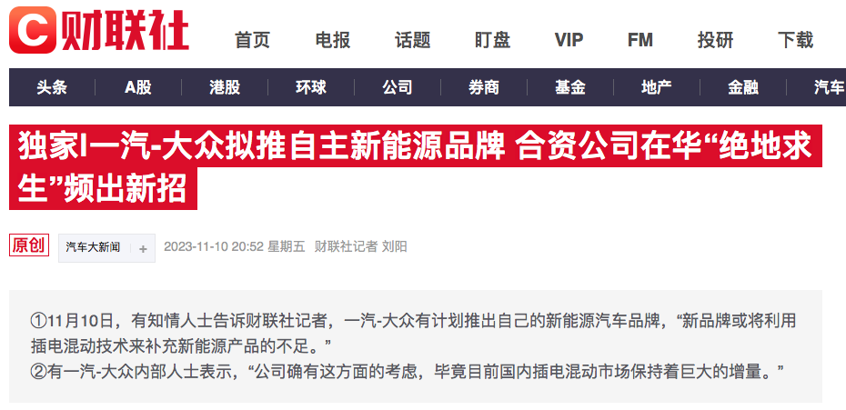 据财联社报道,11月10日,有知情人士称,一汽-大众有计划推出自己的新能源汽车品牌,“新品牌或将利用插电混动技术来补充新能源产品的不足。”而一汽-大众内部人士对此也表示:“公司确有这方面的考虑,毕竟目前国内插电混动市场保持着巨大的增量。”针对上述消息,一汽-大众官方暂未作出回应。实际上,一汽-大众计划推出自主新能源品牌对于行业而言也是什么意外事。得益于混动车型销量的快速攀升,如今押注混动市场已成为...