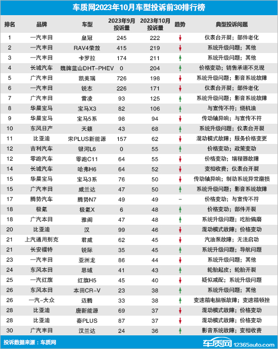 据车质网统计数据显示,2023年10月共受理车主有效投诉信息16428宗,环比下降12.4%,同比上涨44.4%。数据显示,10月有效投诉信息共涉及806款车型,其中投诉达两位数(含)以上的车型158款。需要注意的是,2023年1-10月累计投诉量已超2022年全年总投诉量。从“2023年10月车型投诉TOP30排行榜”显示的来看,榜单前十名车型中,丰田汽车在华两家合资车企成为投诉榜“重灾区”,其...