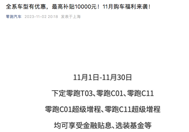 年底冲量是汽车制造商的惯用做法,进入11月后,多家车企纷纷推出降价优惠活动,以此冲击销量。11月2日晚间,零跑汽车官宣旗下全系车型降价,至高金融贴息10000元/台。零跑汽车表示,自11月1日-11月30日下定零跑T03、零跑C01、零跑C11、零跑C01超级增程、零跑C11超级增程均可享受金融贴息、选装基金等。这并非零跑汽车年内首次降价。今年8月,零跑汽车宣布旗下两款C11车型和三款C01车型,...