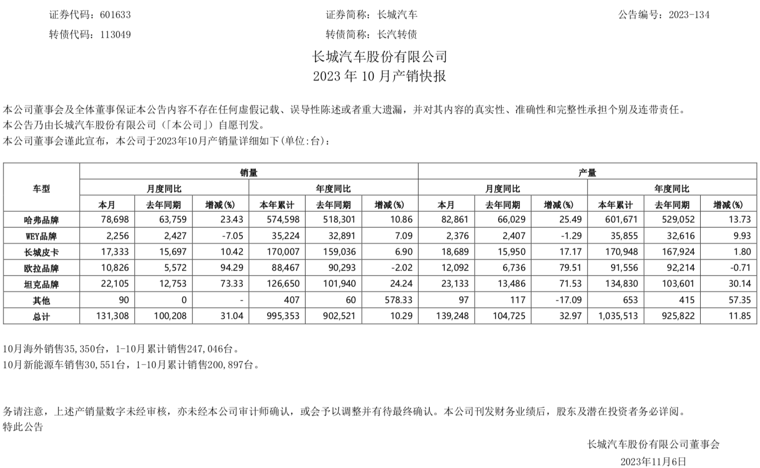 11月7日,长城汽车发布10月产销快报。数据显示,10月长城汽车批发销量为131308辆,同比增长31.04%;1-10月累计批发销量为995353辆,同比增长10.29%。按照160万辆年销目标计算,意味今年前10个月长城汽车的年销目标完成率为62.21%,换而言之,长城汽车想要在剩下的两个月时间实现37.79%的年销目标可能性并不大。细分到各大品牌来看,长城汽车10月仅魏牌出现同比下滑趋势,其...