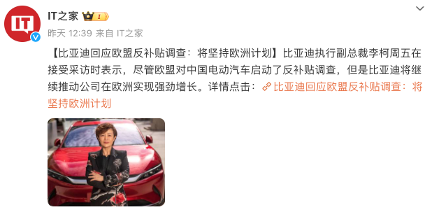 10月4日,欧盟委员会正式发布公告,决定对进口自中国的纯电动汽车发起反补贴调查。同日,商务部表示,欧方发起此次反补贴调查仅依据对所谓补贴项目和损害威胁的主观臆断,缺乏充足证据支持,不符合世贸组织相关规则,中方对此表示强烈不满。欧方要求中方在极短时间内进行磋商,且未提供有效的磋商材料,严重损害了中方权利。10月7日,汽车厂商比亚迪也做出回应。据媒体报道,比亚迪执行副总裁、比亚迪美洲地区总裁李柯在接受...