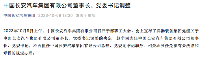 10月9日傍晚,中国长安汽车集团官方宣布,中国长安汽车集团有限公司召开干部职工大会。会上宣布了兵器装备集团党组关于中国长安汽车集团有限公司董事长、党委书记调整的决定:赵非同志任中国长安汽车集团有限公司董事长、党委书记,不再担任中国长安汽车集团有限公司总裁、党委副书记职务。相关职务任免按有关法律和章程的规定办理。目前赵非的职务已在中国长安官网上更新。中国长安的领导班子显示为赵非、刘志岩、朱兴佳、马洪...