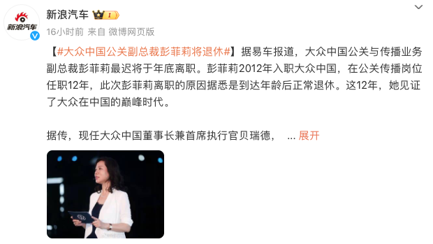 10月9日,媒体报道称,大众汽车集团(中国)副总裁、公关传播及企业社会责任部负责人彭菲莉最迟将于年底离职。针对这一消息,大众方面向媒体表示,彭菲莉“是正常退休了”。有媒体在报道中指出,现任大众中国董事长兼首席执行官贝瑞德,于去年8月上任后,就一直在物色这一岗位新的人选,接下来大众中国的品牌传播是否会有一些新的动作可以期待一下。据了解,彭菲莉于2012年11月出任大众汽车集团(中国)主管公关与传播业...