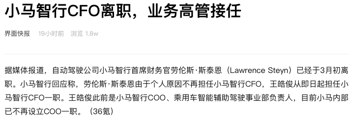 国内自动驾驶初创公司小马智行发生重大人事变更。消息称,小马智行首席财务官劳伦斯·斯泰恩(LawrenceSteyn)于3月初离职,小马智行表示,劳伦斯·斯泰恩因个人原因不再担任小马智行CFO,王皓俊从即日起接替该职位,担任小马智行CFO一职。《汽车行业关注》查看小马智行官网时发现,王皓俊已出现在官网领导班子行列,担任公司CFO首席财务官职位。王皓俊是小马智行创始成员之一,曾担任过众多核心领导角色,...